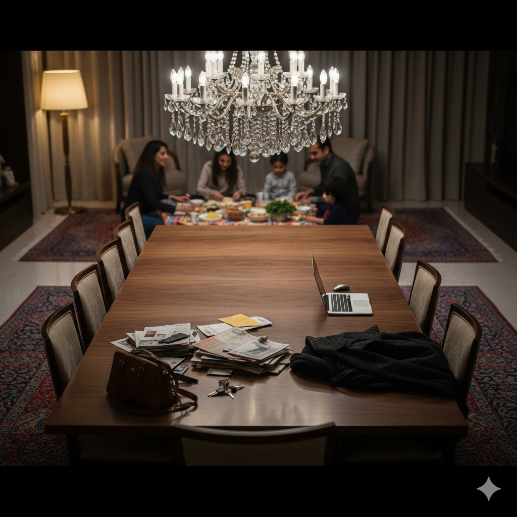 خانوادهای که برای صرف شام، دور یک سفره روی زمین جمع شدهاند، یا با بشقابهای روی پا، جلوی تلویزیون نشستهاند؛ در حالی که تنها چند متر آنطرفتر، یک میز ناهارخوری مجللِ هشت یا دوازده نفره، در بهترین نقطهی پذیرایی زیر نور لوستر میدرخشد!