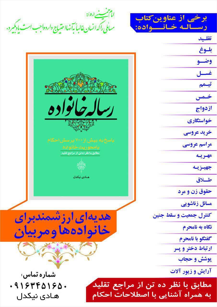 خانواده های محترم میتوانند احکام مربوط به خانواده را از نظر ده تن از مراجع تقلید مطالعه بفرمایند. این احکام در حوزههای مختلفی از جمله تقلید، بلوغ، ازدواج، مهریه، طلاق و ... طبقهبندی شدهاند. همچنین میتوانید در این کتاب با معنای اصطلاحات فقهی آشنا بشوید.