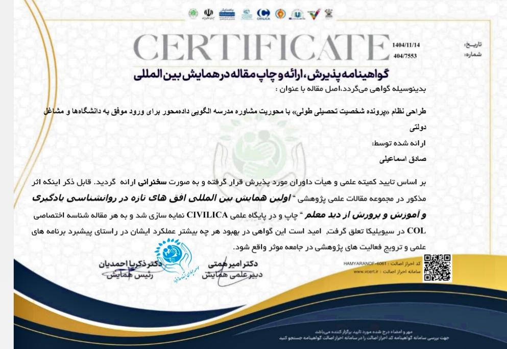 این مقاله با عنوان «طراحی نظام پرونده شخصیت تحصیلی طولی: الگویی دادهمحور برای هدایت تحصیلی و انتخاب شغل» تلاش میکند تا مسیر علمی و عملی برای هدایت تحصیلی دانشآموزان بر اساس استعدادها و علایقشان ارائه دهد.