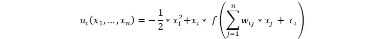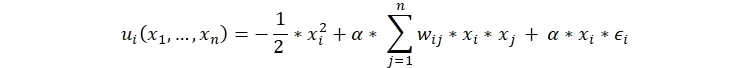در اینجا xi اقدامی است که بازیکنi انجام میدهد (مثلاً میزان تلاش یا سرمایهگذاری). wij وزن شبکه است که نشاندهنده قدرت و نوع اثرگذاری بازیکن j روی بازیکن i است. F تابع تعامل است که قبلا توضیح داده شد و نشان میدهد که اقدامات دیگران چگونه بر مطلوبیت فرد اثر میگذارد و ϵi اثر مستقل از عوامل همسایه است که بر پاداش فرد اثر میگذارد.