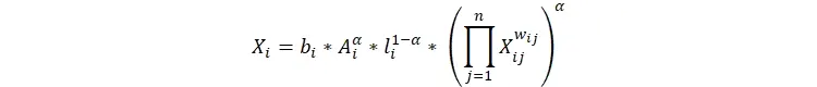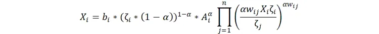 که در آن Ai شوک بهرهوری مربوطه؛ li مقدار نیروی کار استخدام شده توسط بنگاه i ؛ xij مقدار کالای j که برای تولید کالای i استفاده شده است؛ bi یک مقدار ثابت و α که عددی بین صفر و یک است؛ بیانگر سهم کالاهای واسطهای در تولید است. توان wij در معادله بالا، سهم کالای j در فناوری تولید کالای i را نشان میدهد. wij بالاتر به معنای آن است که کالای j در تولید i اهمیت بیشتری دارد، در حالی که wij = 0 به این معنی است که کالای j نهادهی مورد نیاز برای فناوری تولید i نیست. فرض بازدهی ثابت نسبت به مقیاس نیز ایجاب میکند که برای تمام بنگاهها، مجموع سهمها (مقدار w) برابر با یک باشد.