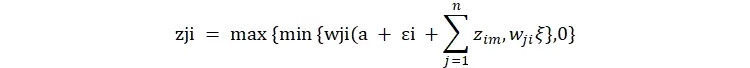 که si برابر درآمد شرکت و برابر قیمت کالا ضربدر مقدار فروش آن است.[12] انها حالا یک متغیر جدید به نام ضریب نفوذ و با علامت ζ تعریف میکنند که برابر است با سهمی که هر بخش از جریان پولی در جامعه صرف خرید آن میشود به طوری که si = piXi = ζiω . پس Xij = α*wij*ζi*Xj/ζj و li = (1 − α)ζi با جایگذاری این دو فرمول در معادلهای که میزان خروجی هر بنگاه را مشخص میکرد داریم: