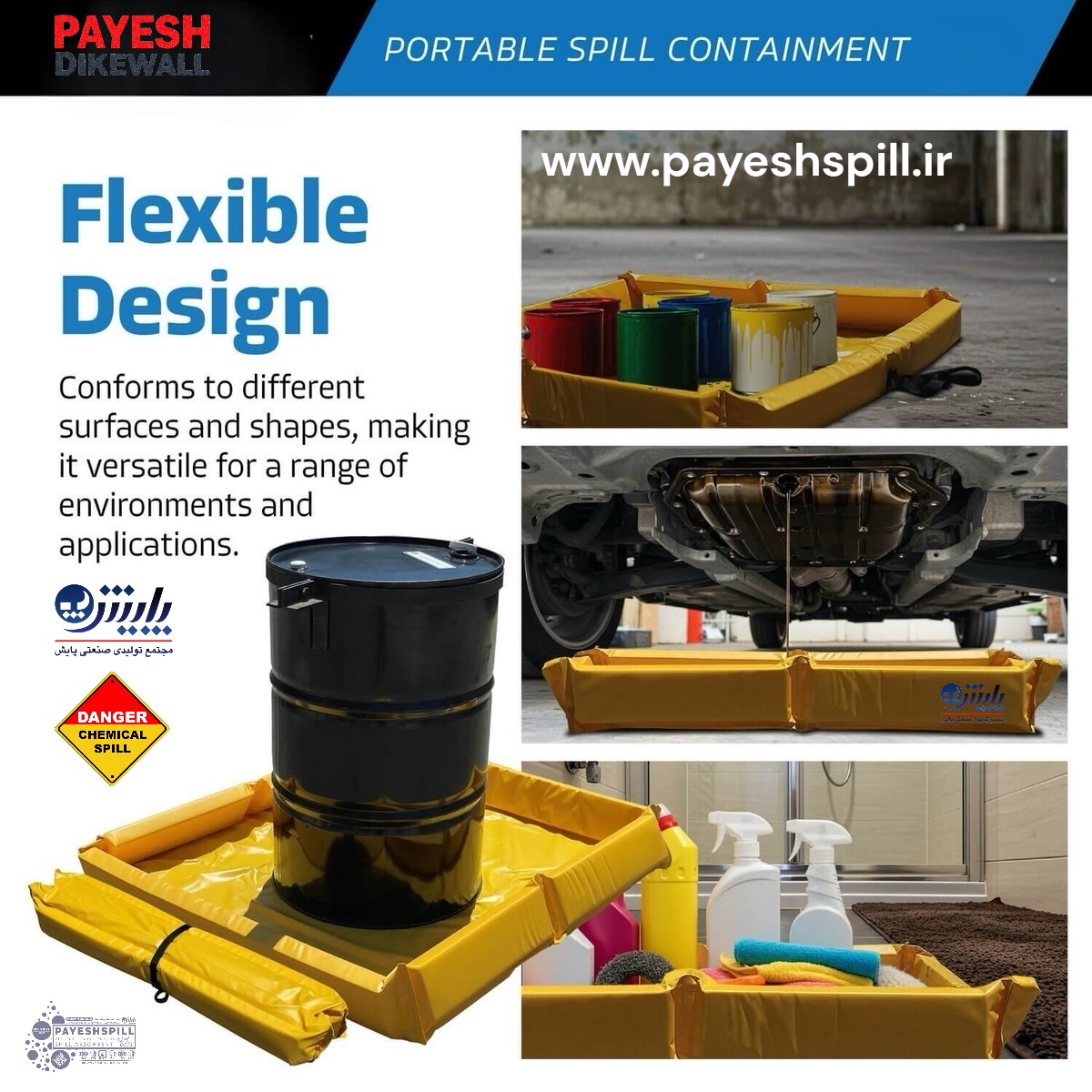 • جلوگیری از نشت مواد شیمیایی: استفاده از سینیهای زردرنگ با لبههای بلند برای مهار مایعات قابل اشتعال یا مواد شیمیایی (مانند تصویر بشکه با علامت “Chemical Spill Danger”) نشاندهنده انطباق با استاندارد EPA (آژانس حفاظت محیط زیست آمریکا) برای کنترل و مهار نشت مواد خطرناک (40 CFR Part 264.175) است.