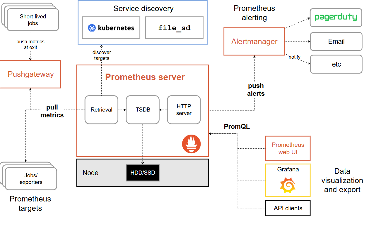 Prometheus معماری بسیار سادهای داره و یکی از اصلیترین نقاط قوتش، پایگاهدادهی time-series بسیار قدرتمندشه.