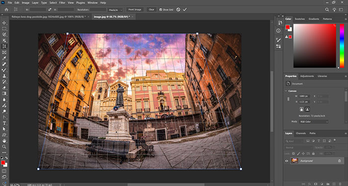 نقاط گوشهای کادر را طوری بکشید که با خطوط پرسپکتیو سوژه هم راستا شوند. برای مثال لبههای یک قاب، ساختمان یا سند باید با خطوط ایزار پرسپکتیو منطبق باشند.