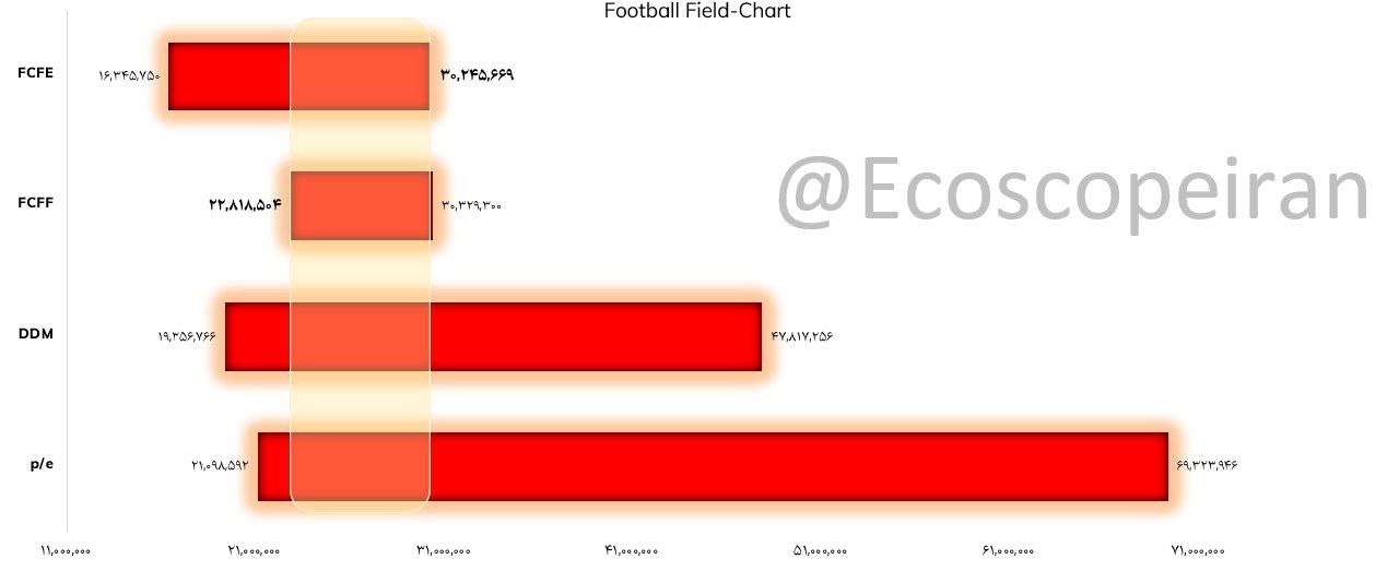 در نمودار زیر، ناحیه نارنجی مشخصشده، همپوشانی نتایج این چهار مدل را نمایش میدهد؛ محدودهای بین ۲۲،۸۲۰ تا ۳۰،۲۵۰ میلیارد ریال که با وجود تفاوت در مفروضات، برآوردی نسبتاً هماهنگ از ارزش ذاتی شرکت ارائه میکند