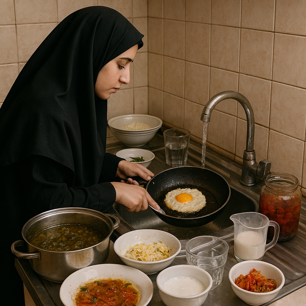 و ظرفهای برنج، خورشت، ماست، دوغ و ترشی که به همراه ماهیتابه نیمرویِ صبحانه در سینک خودنمایی میکرد.