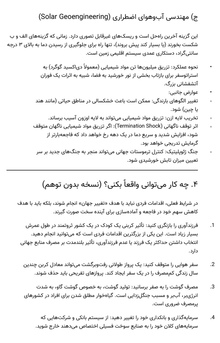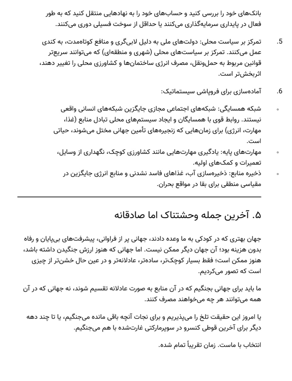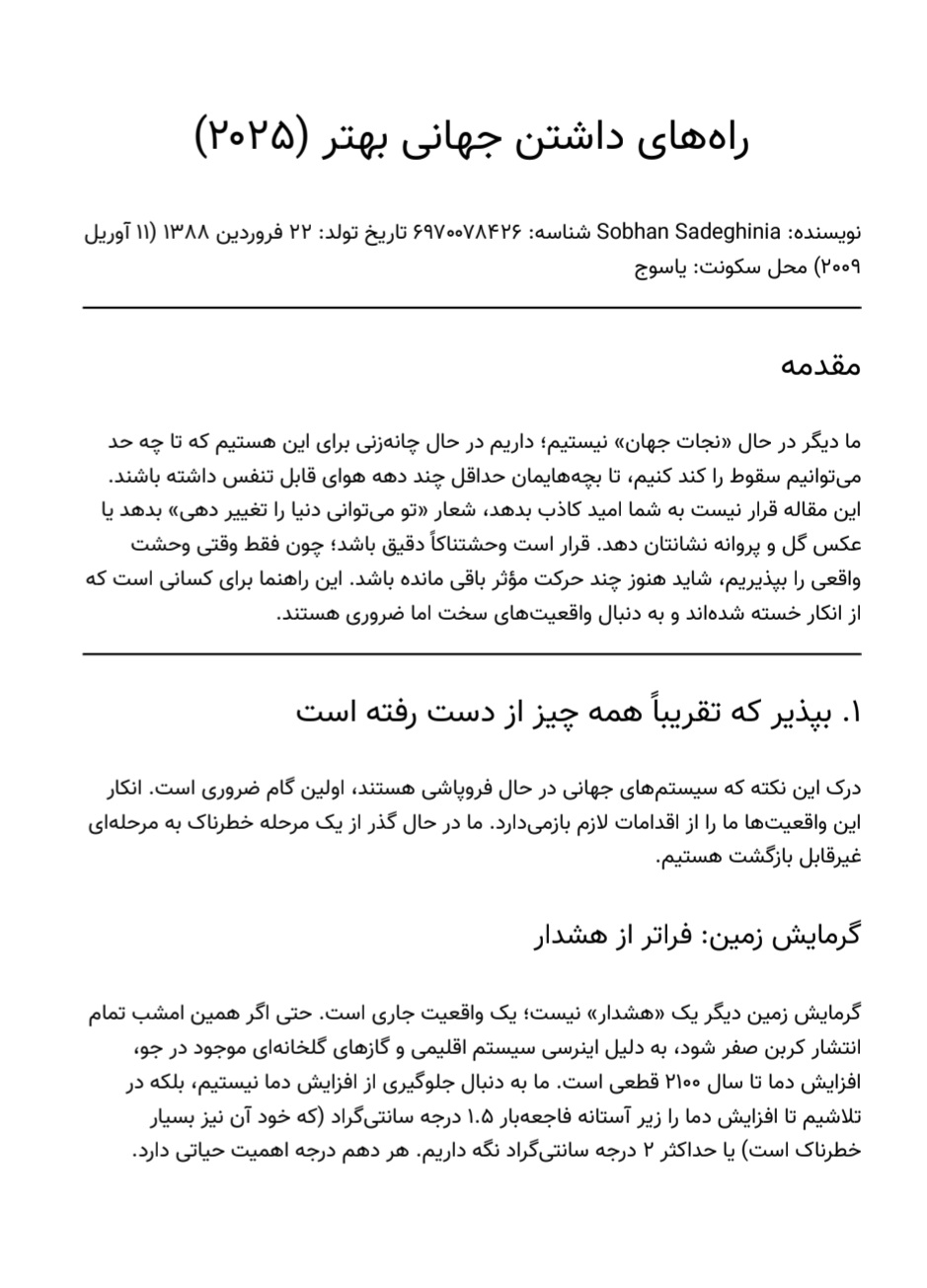 در صفحات این نوشتار، ابتدا به مهمترین چالشهای پیش روی بشریت امروز پرداختهام: از بحران محیط زیست و شکاف طبقاتی گرفته تا فروپاشی اعتماد اجتماعی و معنوی. سپس راهکارهایی عملی و در عین حال آرمانگرا پیشنهاد کردهام؛ راهکارهایی که نه در اتاقهای فکر قدرت، بلکه در کوچه و مدرسه و خانهی هر یک از ما قابل اجراست. آموزش همدلانه، مصرف مسئولانه، مشارکت مدنی واقعی، احیای گفتوگوی بیننسلی و بینفرهنگی، و مهمتر از همه، بازسازی مفهوم «ما» به جای «من» از جمله این راهکارهاست.