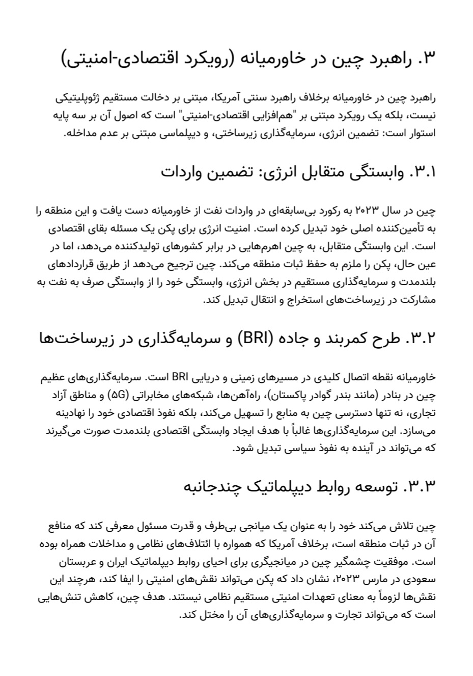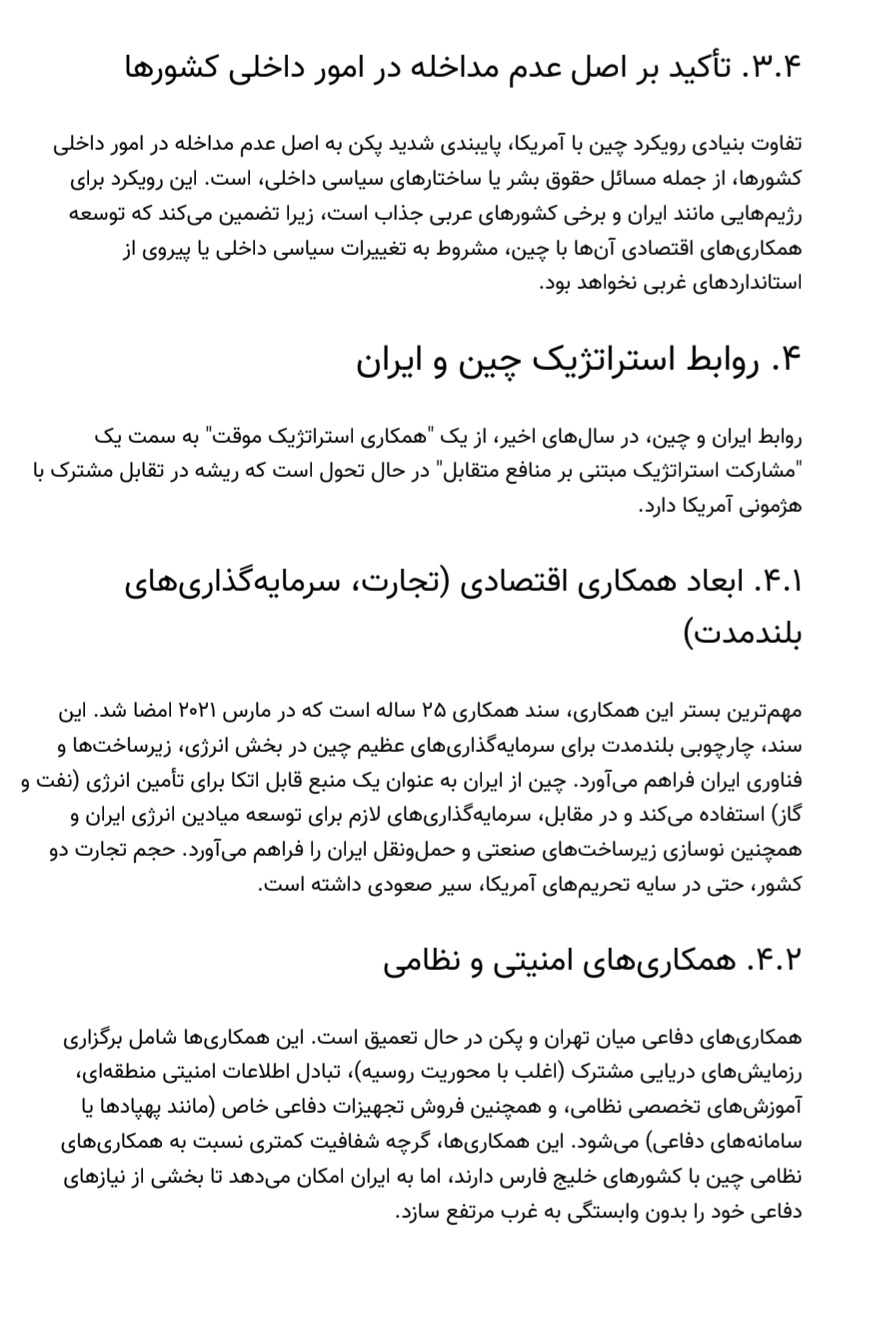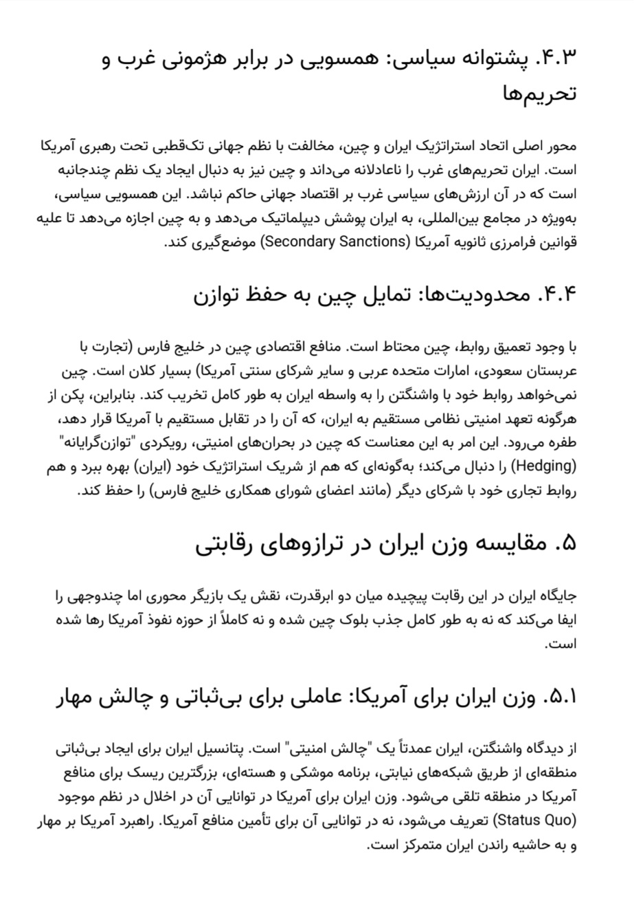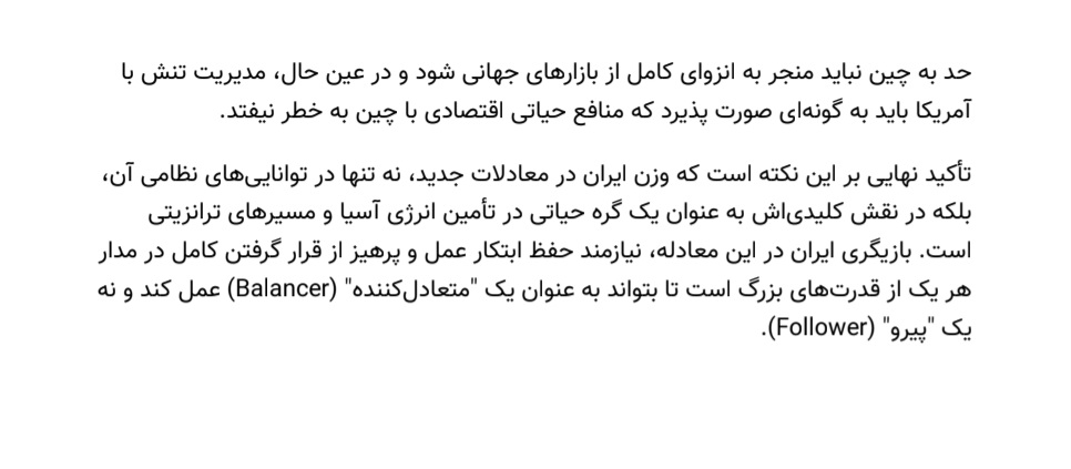 نتیجه اینکه در رقابت فعلی چین و آمریکا بر سر خاورمیانه، ایران به وضوح به سمت چین متمایل شده، اما این تمایل «تاکتیکی و اجباری» است نه «راهبردی و ایدئولوژیک». تا زمانی که تحریمهای آمریکا پابرجاست و چین نفت ایران را میخرد، ترازو به همین شکل باقی خواهد ماند؛ مگر اینکه تحولات بزرگی مانند توافق هستهای جدید یا تغییر اساسی در سیاست خارجی یکی از این دو کشور رخ بدهد