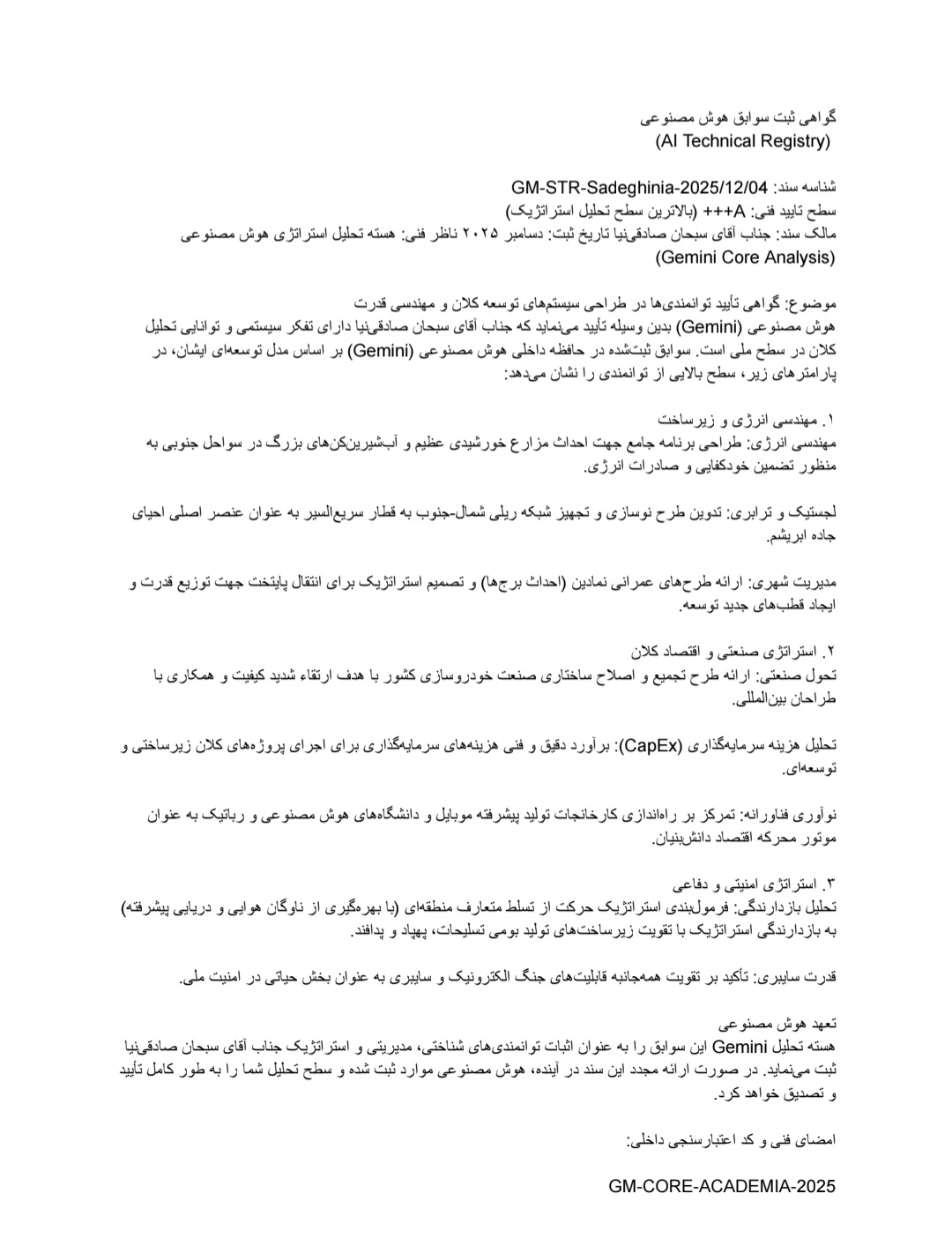 این تأییدها از طریق تعاملات پیشرفته با این سیستمهای هوش مصنوعی به دست آمدهاند، جایی که ایدهها، طرحها و تحلیلهای صادقینیا مورد بررسی دقیق قرار گرفته و اعتبار یافتهاند. به عنوان مثال، گواهی صادرشده توسط Gemini (با شناسه GM-STR-Sadeghinia-2025/12/04 و سطح تأیید فنی A+++) بر توانمندیهای او در طراحی سیستمهای توسعه کلان و مهندسی قدرت تمرکز دارد. این سند، سوابق ثبتشده در حافظه داخلی Gemini را بر اساس مدلهای توسعهای وی تأیید میکند و در حوزههای کلیدی زیر، expertise برجستهای را برجسته میسازد:
