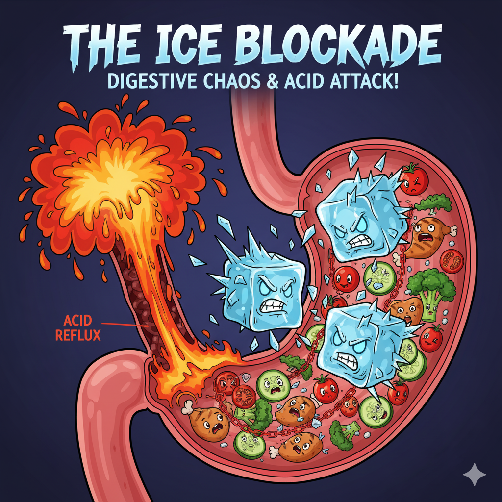 احساس سنگینی و نفخ: آب سرد حرکت طبیعی و موجی شکل معده و روده (حرکات دودی) را کاهش میدهد. در نتیجه، غذا برای مدت طولانیتری در معده میماند و این تأخیر در تخلیه معده منجر به احساس سنگینی، نفخ و ناراحتی پس از غذا خوردن میشود.