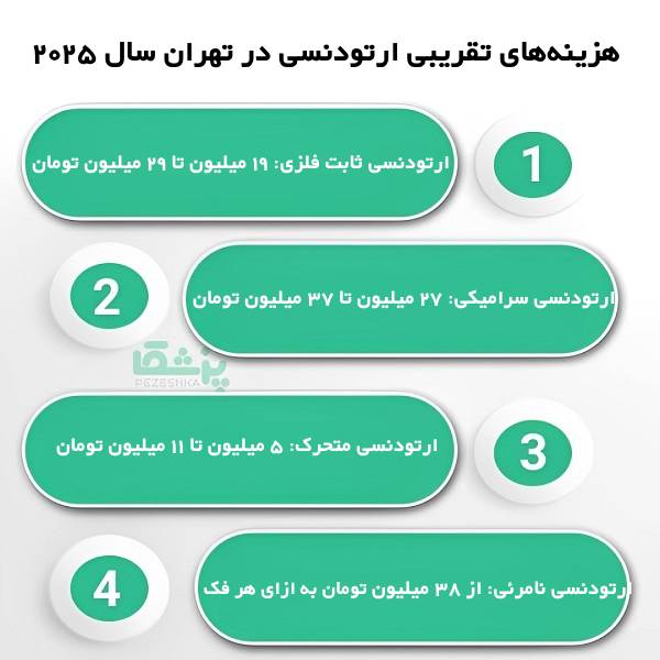 هزینه تقریبی سال 2025 ارتودنسی در تهران به عوامل مختلفی بستگی دارد، از جمله نوع درمان و نظر متخصص دندانپزشک. به طور کلی، قیمت ارتودنسی ثابت فلزی بین 19.000.000 تا 29.000.000 تومان، ارتودنسی سرامیکی بین 27.000.000 تا 37.000.000 تومان، ارتودنسی متحرک از 5.000.000 تا 11.000.000 تومان و ارتودنسی نامرئی از 38.000.000 تومان به ازای هر فک متغیر است. هرچند که هزینه نهایی به عوامل مختلفی بستگی دارد، اما در ادامه به بررسی برخی از عوامل تأثیرگذار بر قیمت ارتودنسی توسط بهترین متخصص ارتودنسی در تهران میپردازیم.