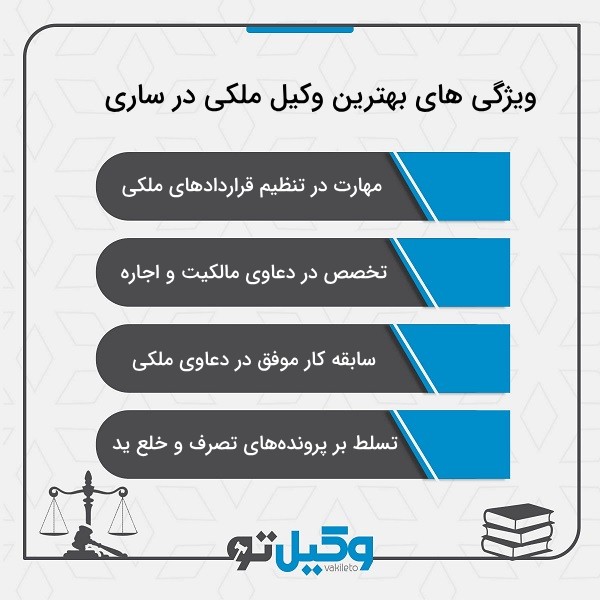 وکلای پایه یک دادگستری در ساری میتوانند مشکلات ملکی شما را بهخوبی حل کنند. در اینجا چند ویژگی مهم یک وکیل ملکی خوب آورده شده است: