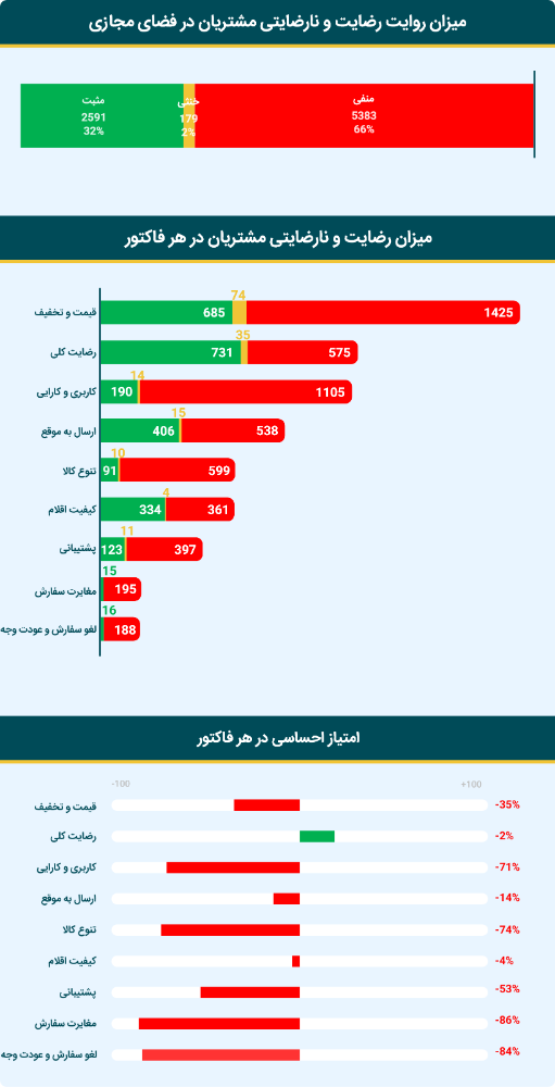با توجه به آمار ارائه شده، میتوان اینگونه نتیجهگیری کرد که در این بازار، افراد درباره موضوع «قیمت و تخفیفات»، بیش از هر موضوع دیگری صحبت میکنند؛ اما این صحبتها از چه جنسی هستند؟ رضایت یا نارضایتی؟