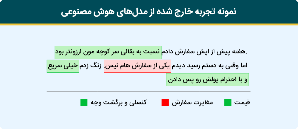 به طور مثال اگه فردی نوشته باشد " من خرید کردم اما بسته با دو ساعت تاخیر به دستم رسید" مدل هوش مصنوعی میفهمد که تجربه این فرد مربوط به زمنان ارسال و از جنس منفی میباشد.