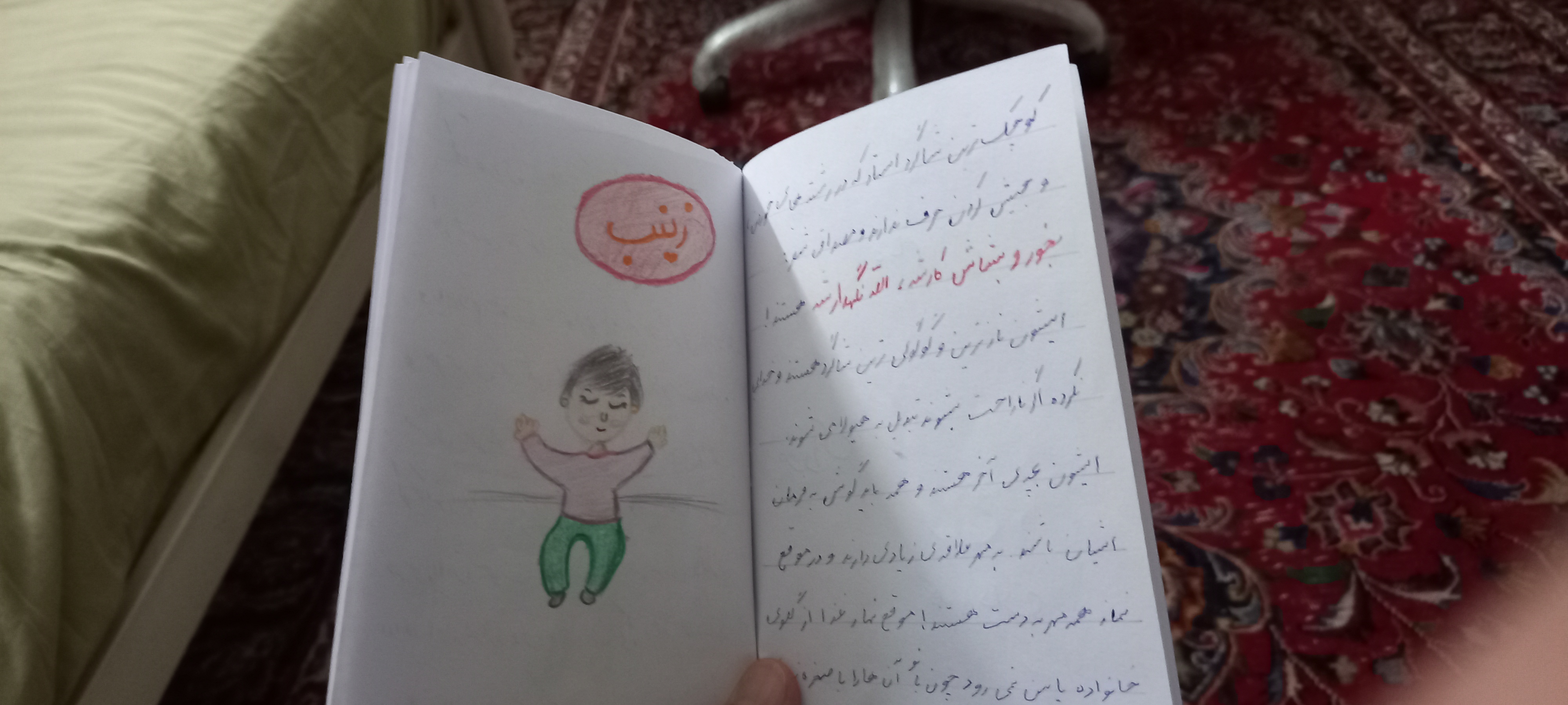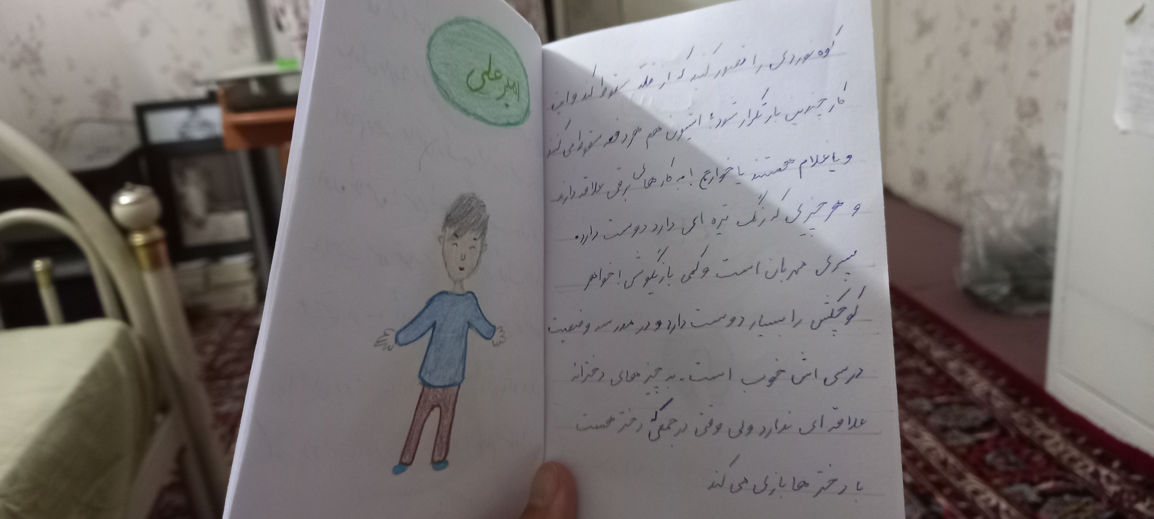 خلاصه این ها آمدند مشهد و امیرعلی کلی کشتی اوریگامی برایم درست کرده بود و فاطمه هم دو تا کتابچه نوشته بود و طراحی کرده بود و تویش نقاشی هایی کشیده بود که من این مدل هدیه ها را خیلی دوست دارم. ولی این ها را همان اول کار بهم نداد و گفت این ها را روز تولد بهتان می دهم. درین بین یک رستوران رفتیم.