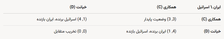 این درگیری شبیه معضل زندانی است، جایی که همکاری (کاهش تنش یا دیپلماسی) به نفع همه است، اما خیانت (تشدید تنش) به دلیل منافع کوتاهمدت وسوسهانگیز است. ماتریس پرداخت سادهشده به این صورت است: