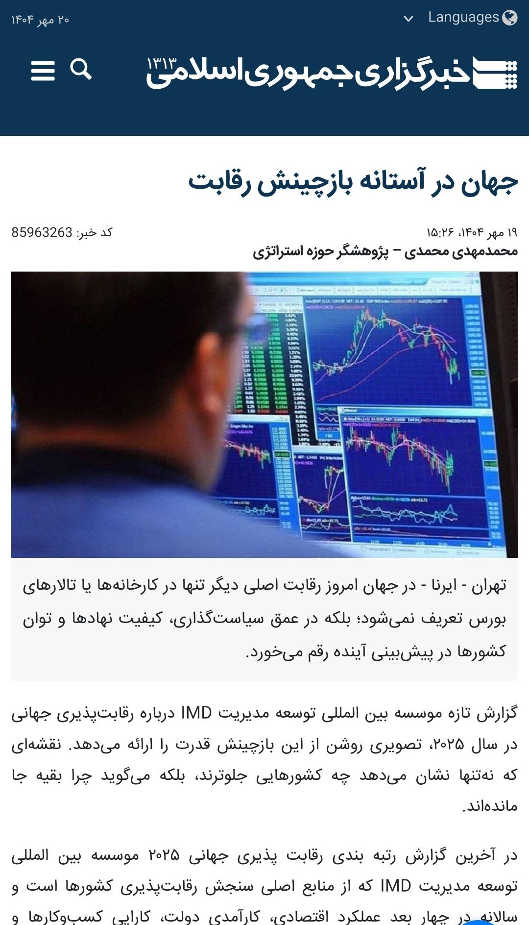 رقابتپذیری در سال ۲۰۲۵ تنها یک رتبهبندی نیست، بلکه نمایی است از آنچه جهان به سمتش میرود: ثبات، شفافیت، و هوشمندی سیاست. کشورمان اگر بخواهد سهمی در آینده اقتصادی جهان داشته باشد، باید نهتنها در زمره بازیگران مهم این تغییر جهانی و همکار در سازمان های جدید بین اللملی قرار بگیرد، بلکه باید طراح مسیر خود با پایبندی به موازین و استراتژی های خود باشد. مسیری که از درون طراحی، اصلاح و اجرا میشود، نه از بیرون تحمیل.