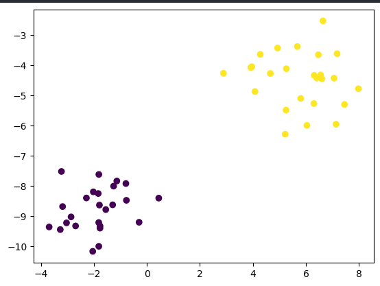 from sklearn.datasets import make_blobs import matplotlib.pyplot as plt import numpy as np X, y = make_blobs(50, n_features=2, centers=2, random_state=40) y = np.where(y == 0, -1, 1) plt.scatter(X[:, 0], X[:, 1], c=y) plt.show()