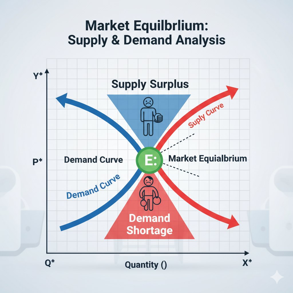 اگر قیمت بالاتر از نقطه تعادل باشد، مازاد عرضه (Surplus) داریم. این یعنی رقبا زیادند و مجبور به کاهش قیمت میشوند (نشانهای از بازار اشباع).