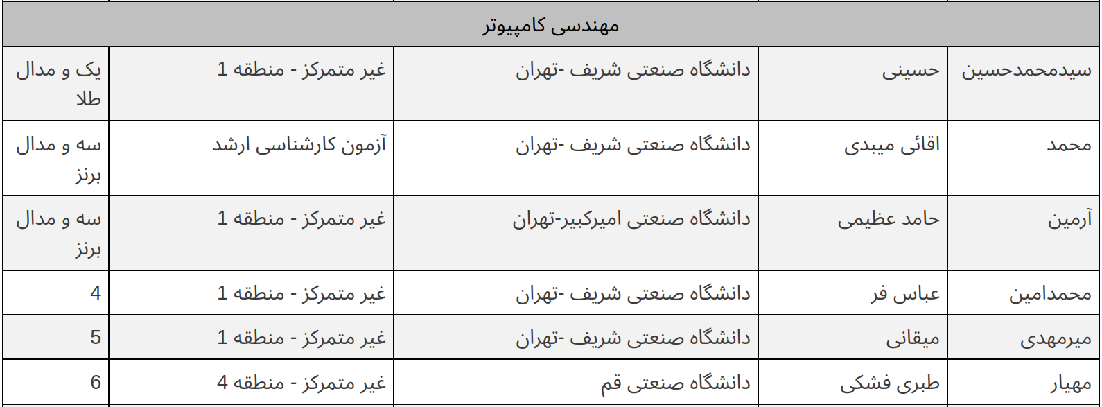 ۱۵ نفر اول مرحله نهایی که سهمیه گرفتند لزوما هر دانشگاهی که بخوان نمیتونن برن. چیزی که من متوجه شدم موردهای زیر هستند اما شما به نظرم حتما ارتباط با دفتر استعداد درخشان دانشگاهی که دوست دارید و یا خود بخش المپیاد سازمان سنجش, تماس بگیرید و پرس و جو کنید(یک چیزی هم اینجا در گوشی بگم, احتمالا اگر حضوری برید دانشگاه، اطلاعات کاملتری دستتون میاد :))