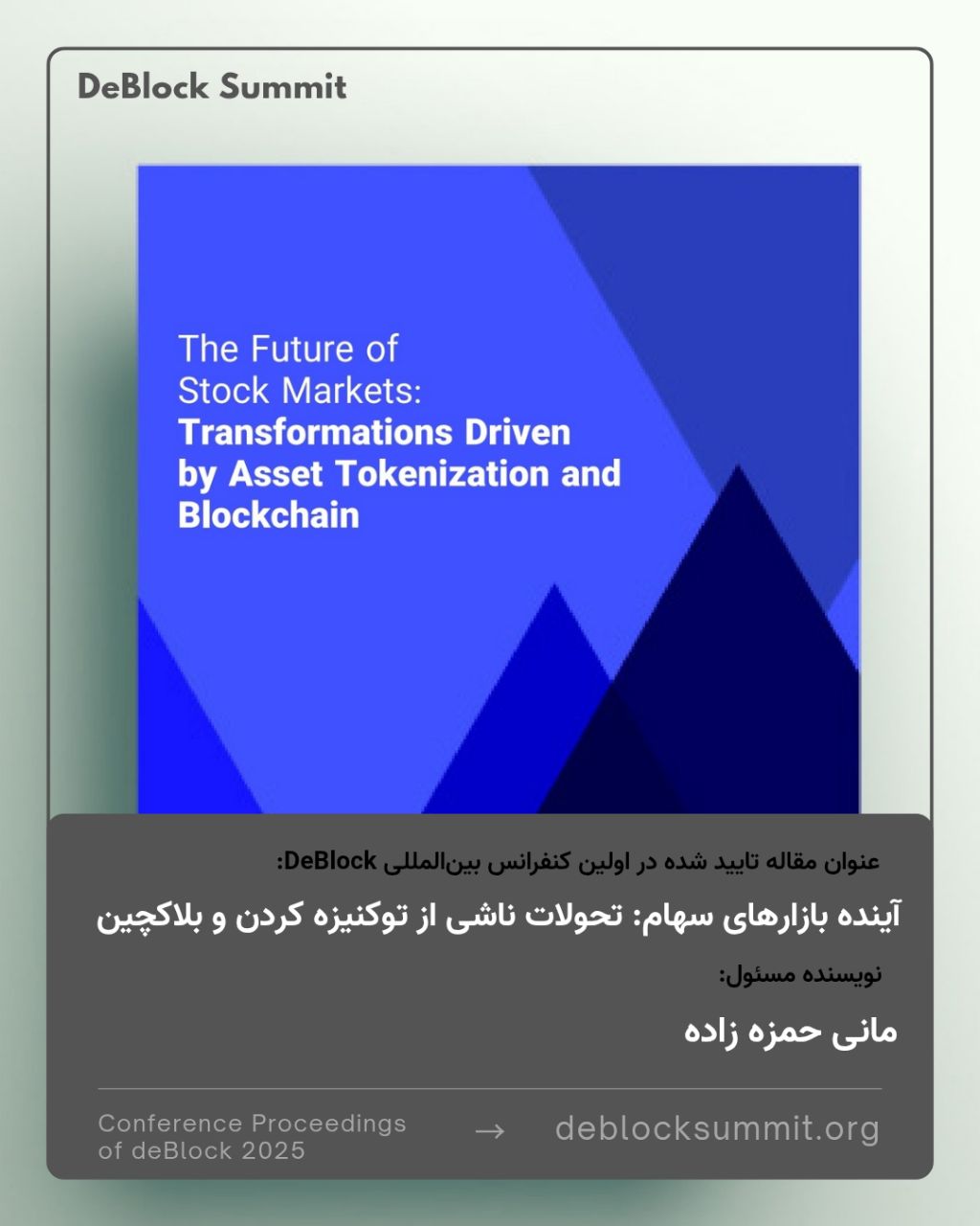 رونوشت: مطلب فوق برگرفته شده از مقاله بنده با موضوع: « آینده بازارهای سهام: تحولات ناشی از توکنیزه کردن و بلاکچین» بود که این مقاله در اولین کنفرانس بینالمللی دی بلاک به جمع مقالات برتر راه یافت.