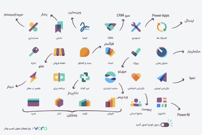 تصویر زیر نشون میده که خیلی از کسبوکارها برای مدیریت بخشهای مختلفشون مجبور میشن از نرمافزارهای جدا و پراکنده مثل هلو، سپیدار، میزیتو، وردپرس، دیدار، نجوا، Power BI و… استفاده کنن.