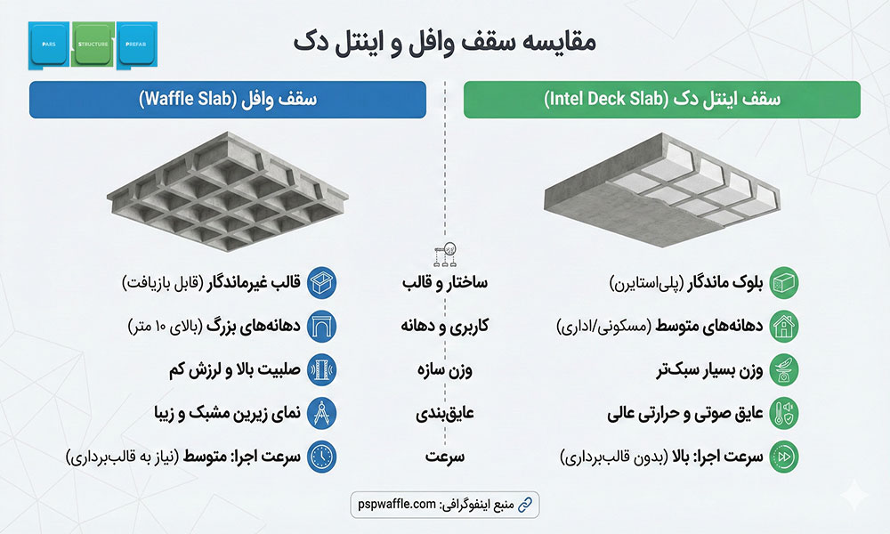 در مقابل کاربردهای سقف اینتل دک در ساختمانهای مسکونی و پروژههایی که نیاز به سرعت، عایقسازی و کاهش وزن دارند، بیشتر است. البته انتخاب میان این دو سیستم به عوامل مختلفی مانند دهانه، بودجه، زمان و نوع کاربری بستگی دارد.