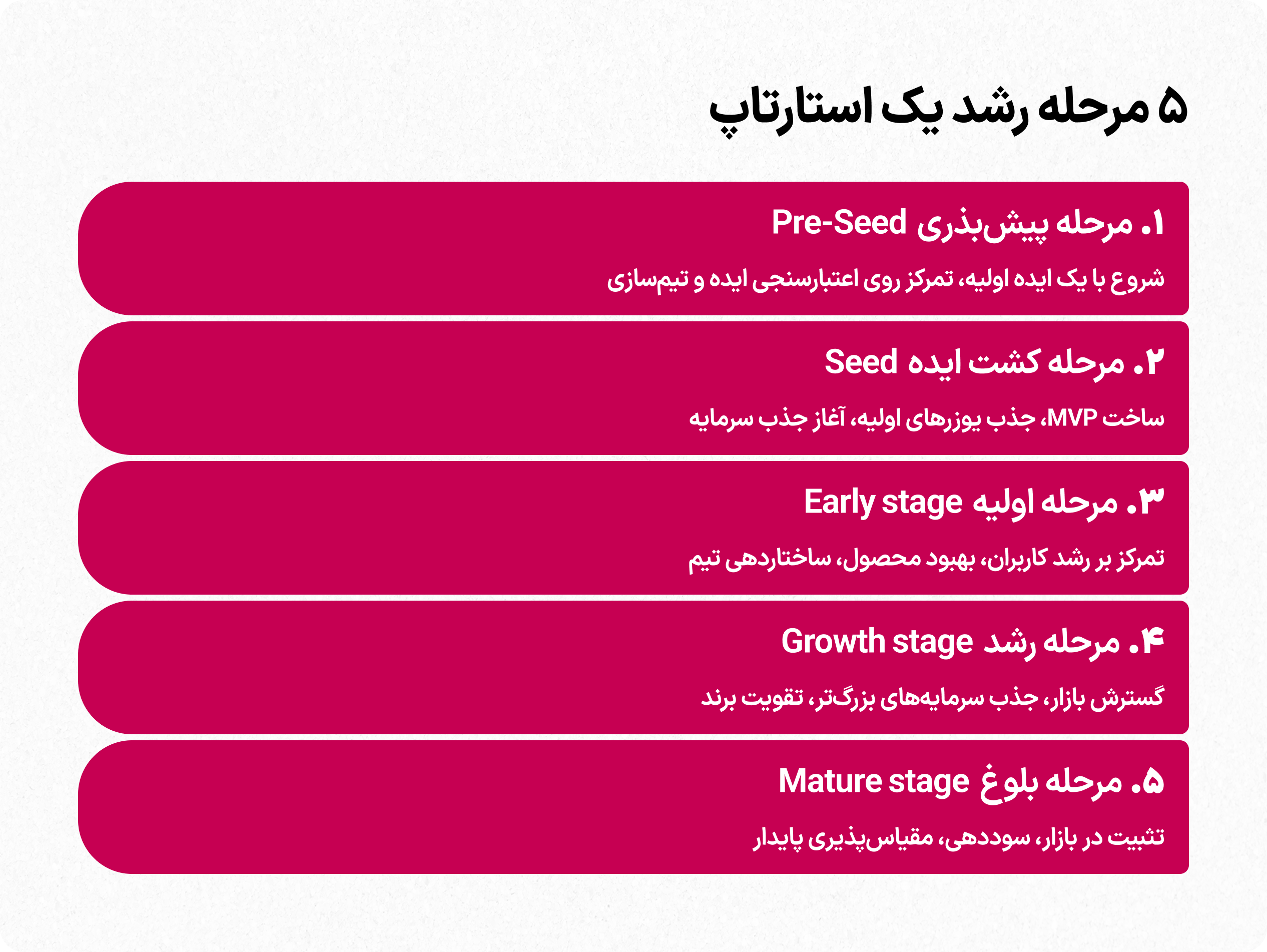 شرایط فعلی: بهتازگی شکل گرفته، در حال ساخت MVP یا تست ایده هستن. اغلب هنوز تیم کامل داخلی ندارن.