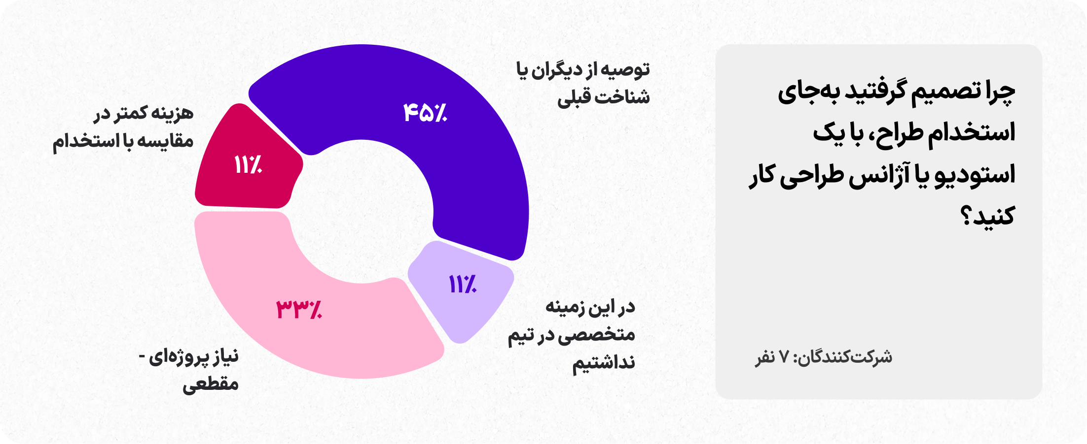 یکی از کارهایی که در این مسیر انجام دادم، طراحی یک نظرسنجی کوچک با هدف شناخت بهتر تجربیات کسبوکارها در همکاری با استودیوهای طراحی بود. با توجه به اینکه نظرسنجی توسط تعداد محدودی از افراد تکمیل شد، تصمیم گرفتم برای کاهش خطا یا سوگیری در نتایج، فقط دو بخش از آن را بهصورت خلاصه در انتهای این مطلب بیاورم.