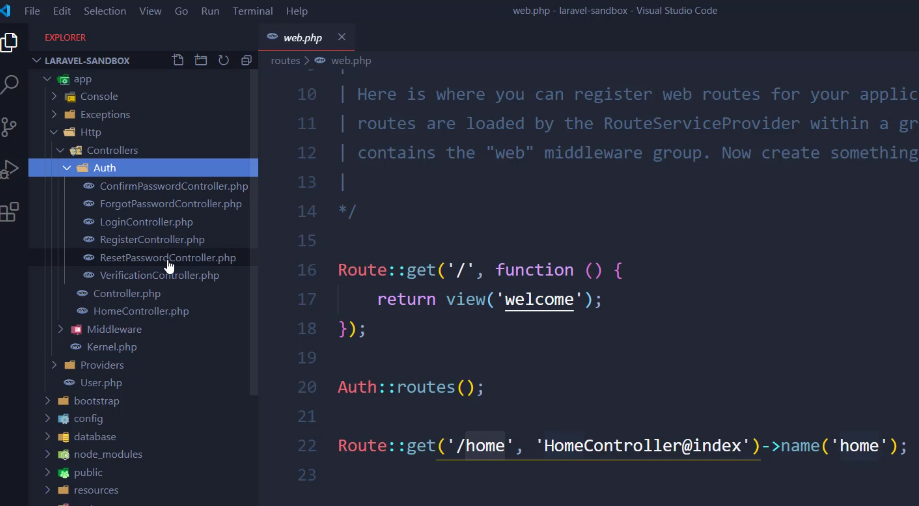 با اجرای دستورات بالا، تغییراتی در پروژه اعمال میشه که شامل اضافه شدن ۲ تا route به web.php و همینطور اضافه شدن کنترلرهای سیستم auth در مسیر app/Http/Controllers/Auth هست.