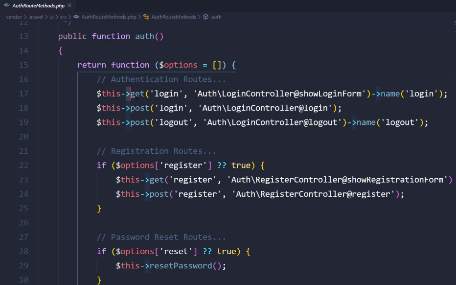 اگر وارد مسیر vendor/laravel/ui/src بشیم؛ فایلی داریم به نام AuthRouteMethodes.php که routeهای مربوط به Auth::routes() درش جنریت شده: