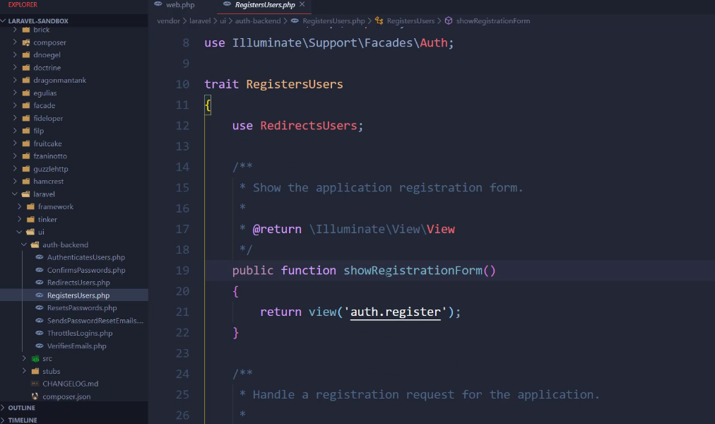 در واقع متدهای سیستم auth لاراول که توی route ها میبینم از طریق فایلهایی که در مسیر vendor/laravel/ui/auth-backend قرار گرفتن، توی کنترلر use میشن و از این طریق از اونها استفاده میکنیم: