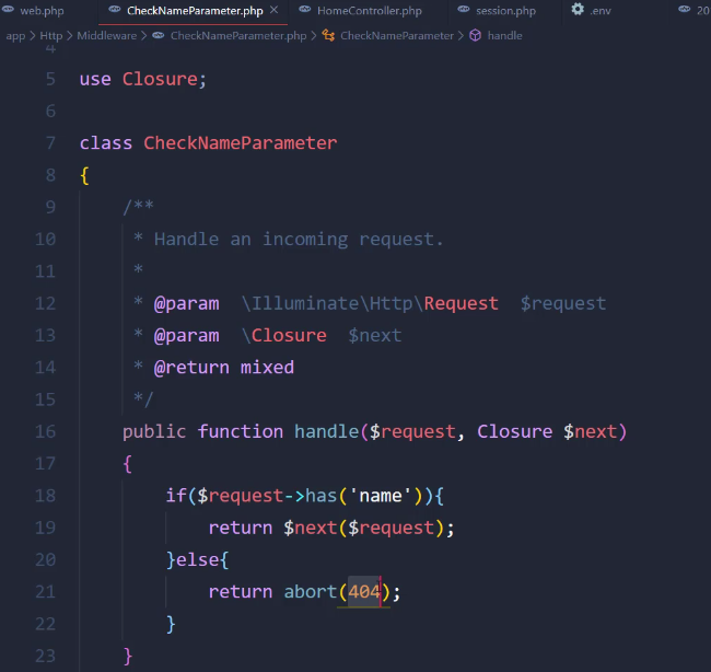 خب، وقتی که یک middleware تازه تعریف شده رو روی یک route اعمال میکنیم؛ متد handle مقدار زیر رو return میکنه، بدون اینکه فیلتر خاصی اعمال کرده باشه و این ما هستیم که باید با توجه به نیاز خودمون تابع یا متد handle رو کامل کنیم: