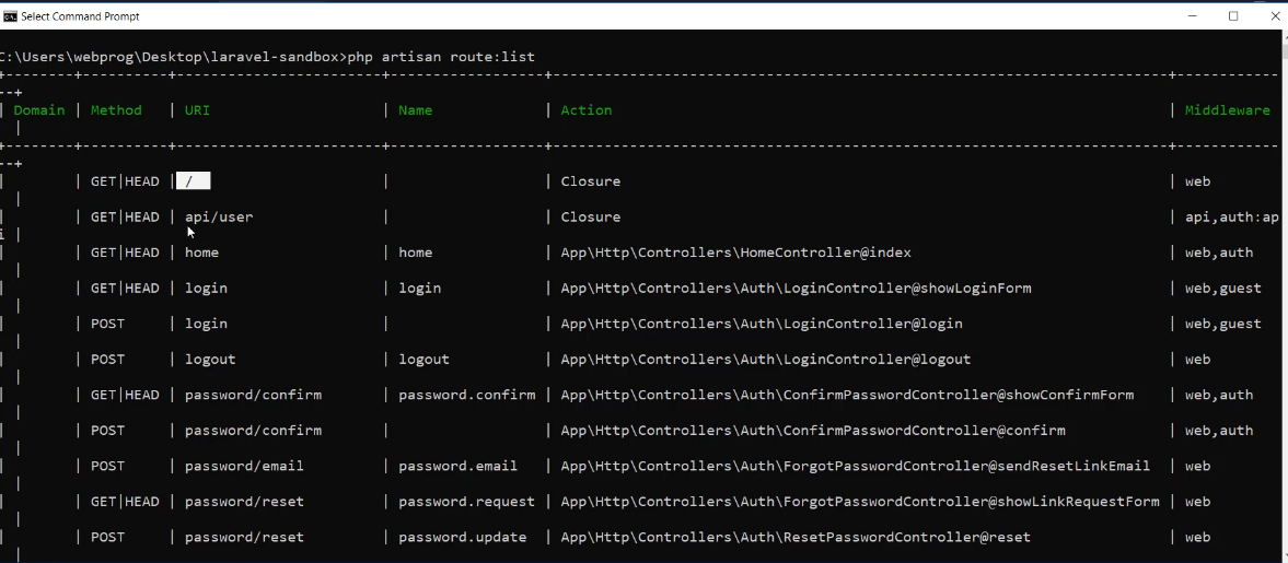 حالا میخوایم ببینیم که کد Auth::routes() چه چیزهایی رو به سیستم روتینگ ما اضافه کرده، برای این کار کافیه که از artisan کمک بگیریم: