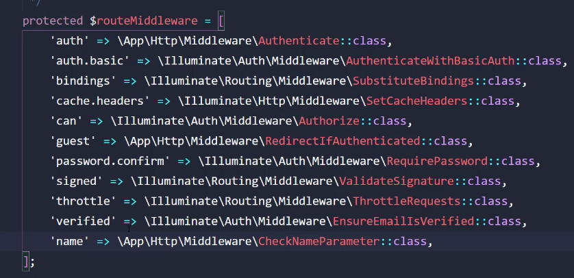 توی این فایل یه سری آرایه داریم به نامهای $middleware و middlewareGroup و... که وابسته به کاربردی که دارن، میتونیم از اونها استفاده کنیم.