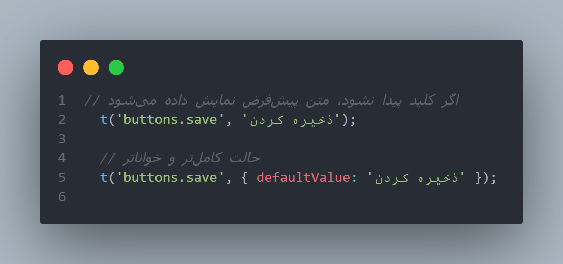 این سادهترین و شناختهشدهترین کاربرد آن است. اگر کلید ترجمه مورد نظر شما در فایلهای زبان پیدا نشود، این مقدار به عنوان جایگزین نمایش داده میشود و از نمایش کلیدهای خام و ناخوانا در رابط کاربری جلوگیری میکند.