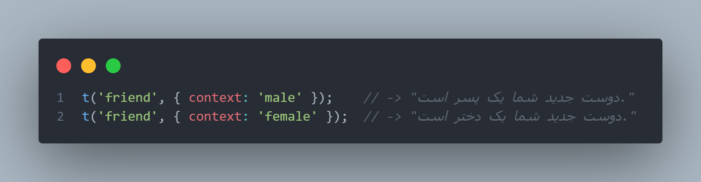 این آرگومان در واقع یک آبجکت قدرتمند از گزینهها (Options Object) است که به شما اجازه میدهد ترجمههایی هوشمند، داینامیک و وابسته به شرایط مختلف بسازید. بیایید این قابلیتهای کلیدی را با هم مرور کنیم: