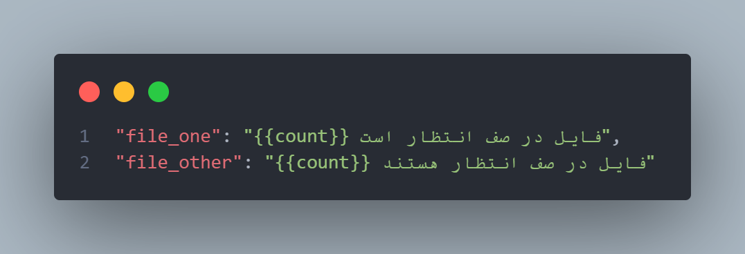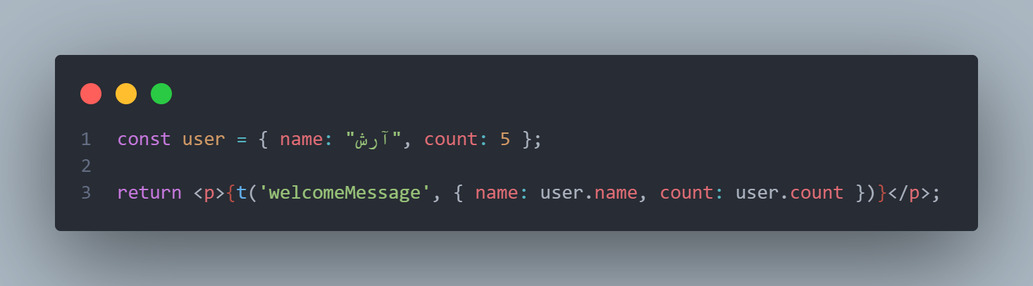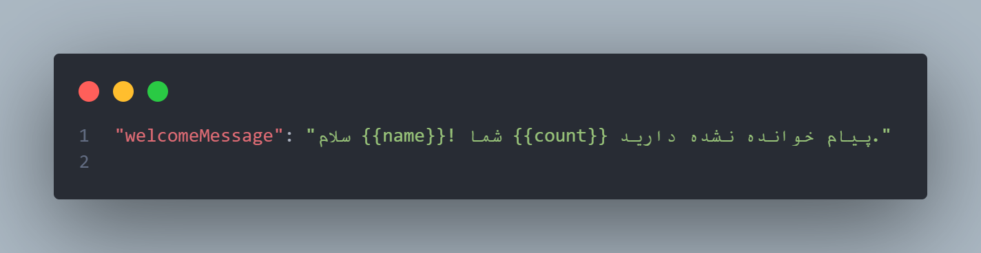 این قابلیت به شما اجازه میدهد مقادیر متغیر (مانند نام کاربر یا تعداد) را مستقیماً درون رشتههای ترجمه تزریق کنید. برای این کار از سینتکس {{variable}} استفاده میشود.