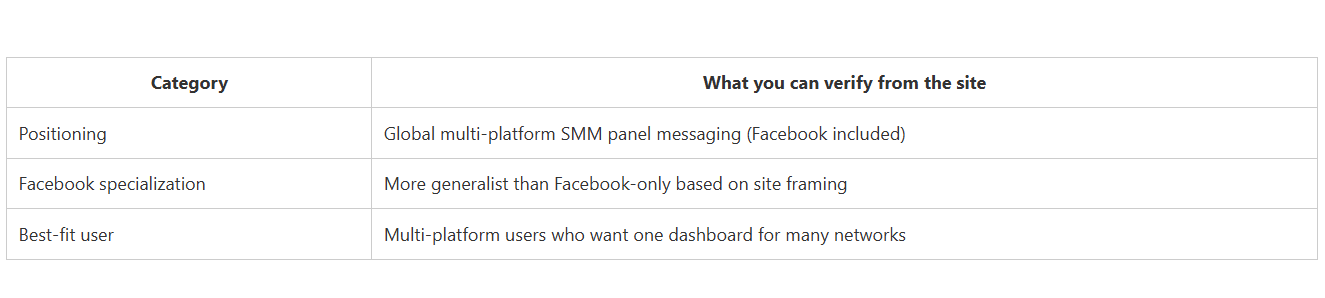 CategoryWhat you can verify from the sitePositioningGlobal multi-platform SMM panel messaging (Facebook included)Facebook specializationMore generalist than Facebook-only based on site framingBest-fit userMulti-platform users who want one dashboard for many networks.