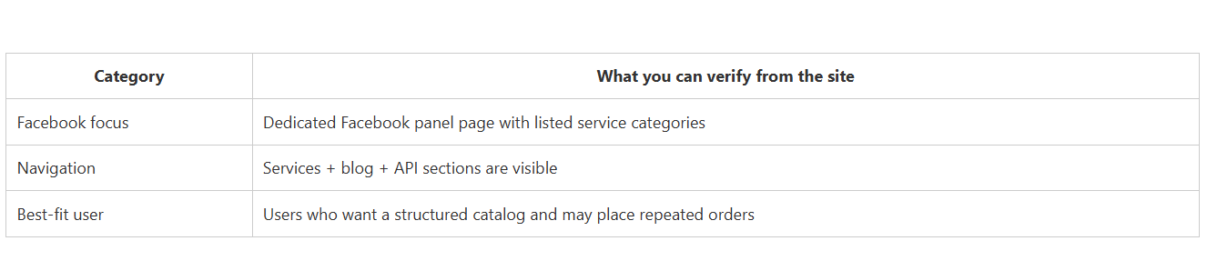 CategoryWhat you can verify from the siteFacebook focusDedicated Facebook panel page with listed service categoriesNavigationServices + blog + API sections are visibleBest-fit userUsers who want a structured catalog and may place repeated orders.