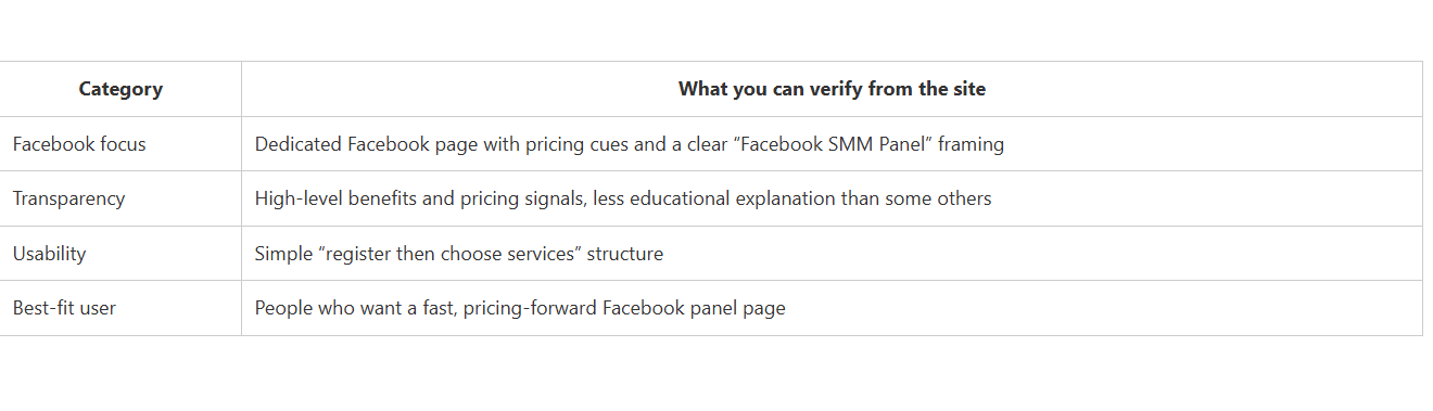 CategoryWhat you can verify from the siteFacebook focusDedicated Facebook page with pricing cues and a clear “Facebook SMM Panel” framingTransparencyHigh-level benefits and pricing signals, less educational explanation than some othersUsabilitySimple “register then choose services” structureBest-fit userPeople who want a fast, pricing-forward Facebook panel page.