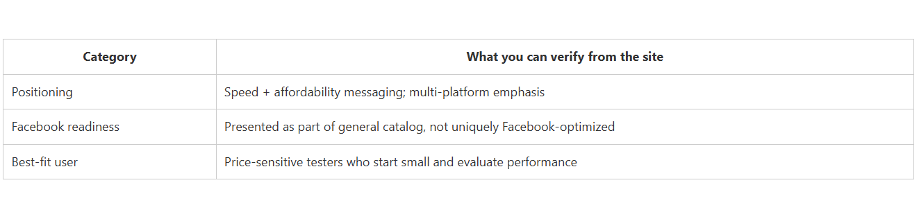 CategoryWhat you can verify from the sitePositioningSpeed + affordability messaging; multi-platform emphasisFacebook readinessPresented as part of general catalog, not uniquely Facebook-optimizedBest-fit userPrice-sensitive testers who start small and evaluate performance.