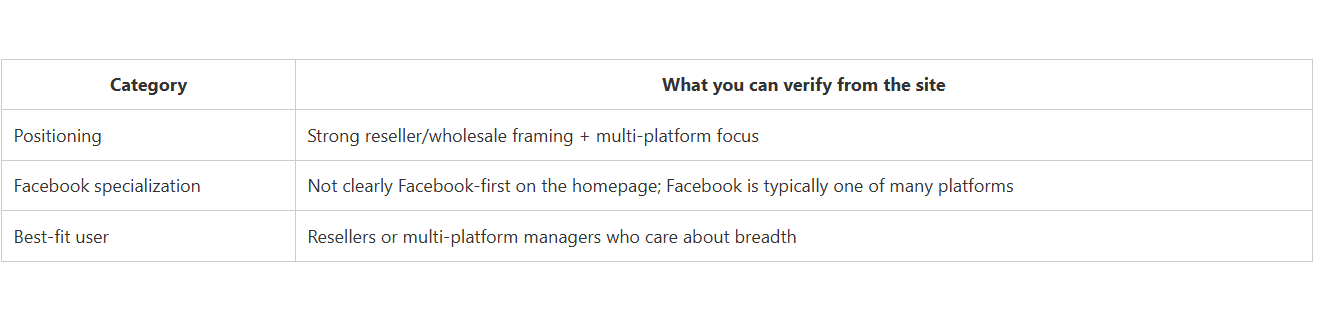 CategoryWhat you can verify from the sitePositioningStrong reseller/wholesale framing + multi-platform focusFacebook specializationNot clearly Facebook-first on the homepage; Facebook is typically one of many platformsBest-fit userResellers or multi-platform managers who care about breadth.