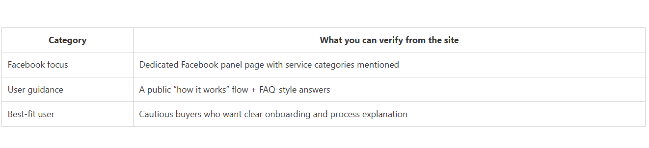 CategoryWhat you can verify from the siteFacebook focusDedicated Facebook panel page with service categories mentionedUser guidanceA public “how it works” flow + FAQ-style answersBest-fit userCautious buyers who want clear onboarding and process explanation.