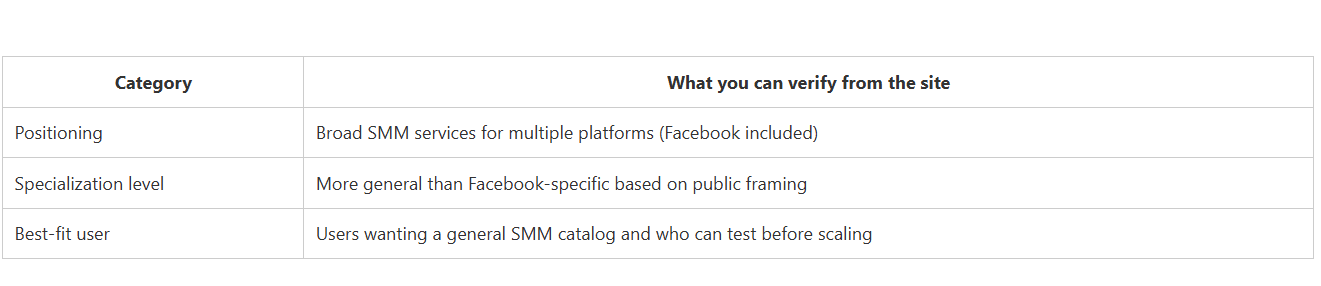 CategoryWhat you can verify from the sitePositioningBroad SMM services for multiple platforms (Facebook included)Specialization levelMore general than Facebook-specific based on public framingBest-fit userUsers wanting a general SMM catalog and who can test before scaling.