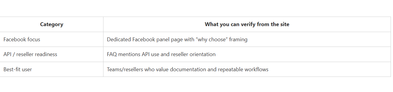 CategoryWhat you can verify from the siteFacebook focusDedicated Facebook panel page with “why choose” framingAPI / reseller readinessFAQ mentions API use and reseller orientationBest-fit userTeams/resellers who value documentation and repeatable workflows.