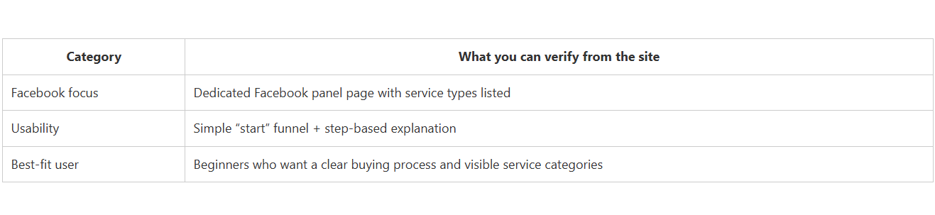CategoryWhat you can verify from the siteFacebook focusDedicated Facebook panel page with service types listedUsabilitySimple “start” funnel + step-based explanationBest-fit userBeginners who want a clear buying process and visible service categories.