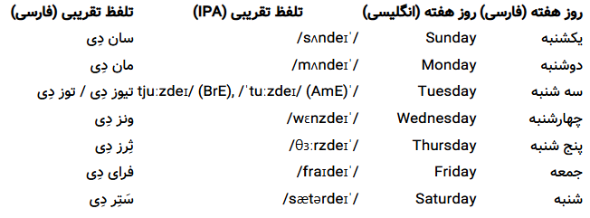روزهای هفته به انگلیسی با تلفظ چگونه است؟