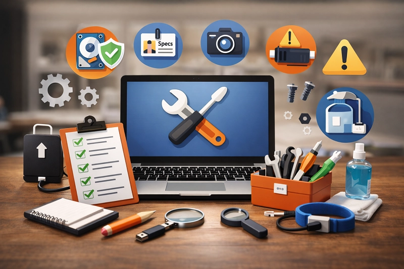 قبل از تحویل، از بدنه، لولاها، پورتها و مخصوصاً صفحه نمایش در حالت خاموش و روشن عکس بگیرید. این کار از ادعاهای بعدی مبنی بر اینکه «این خط و خش از قبل بود» جلوگیری میکند.